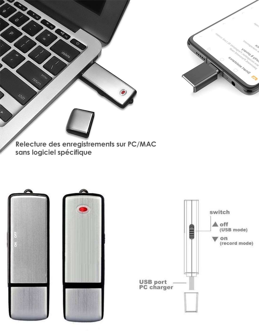 Fonctionnant comme une véritable clé USB, elle permet de consulter les enregistrements simplement en la branchant à un ordinateur. Les fichiers audio peuvent également être récupérés directement sur un téléphone grâce à un adaptateur compatible, sans besoin d’ordinateur.