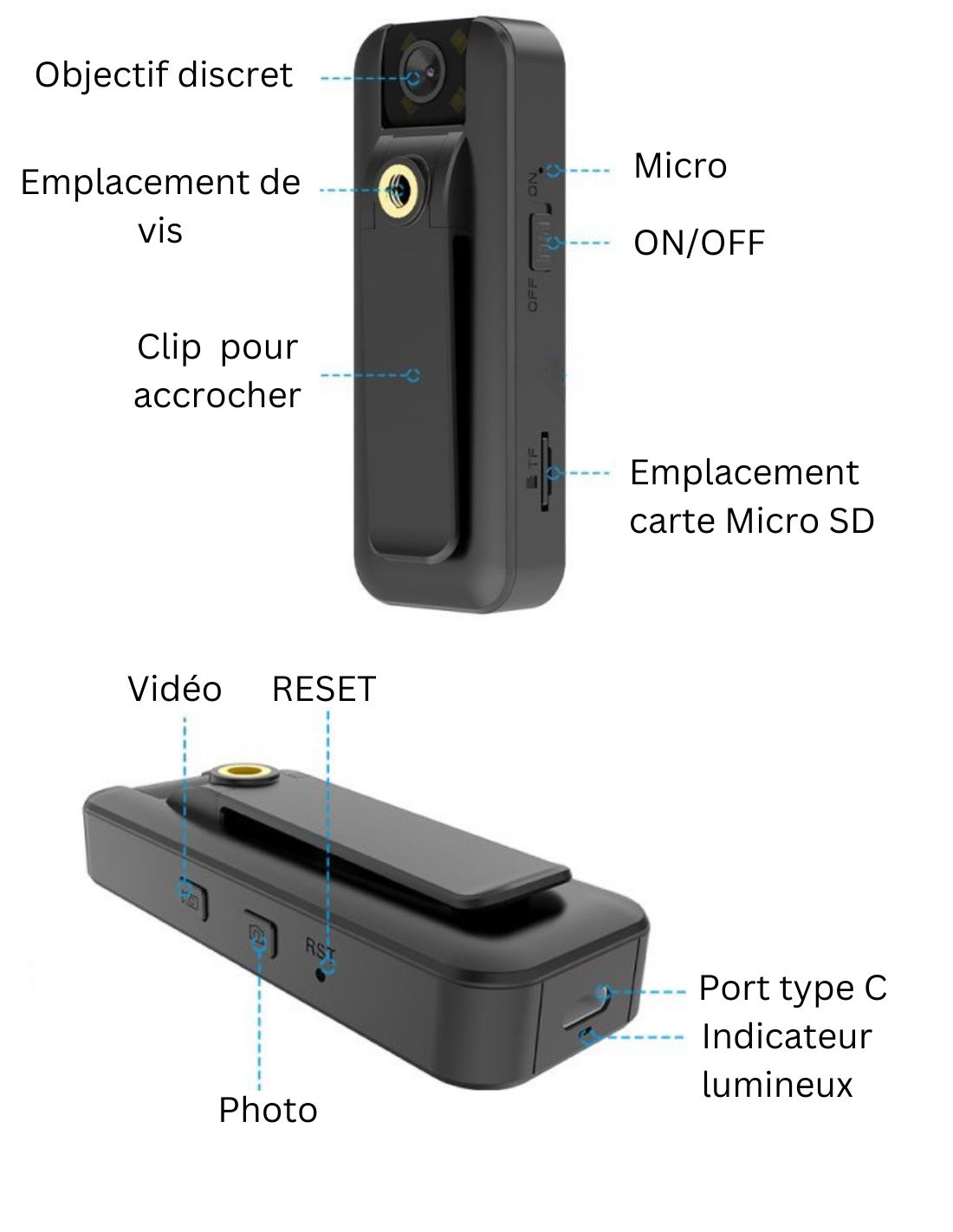 - Enregistrement sur carte micro SD (jusqu'à 128 Go)